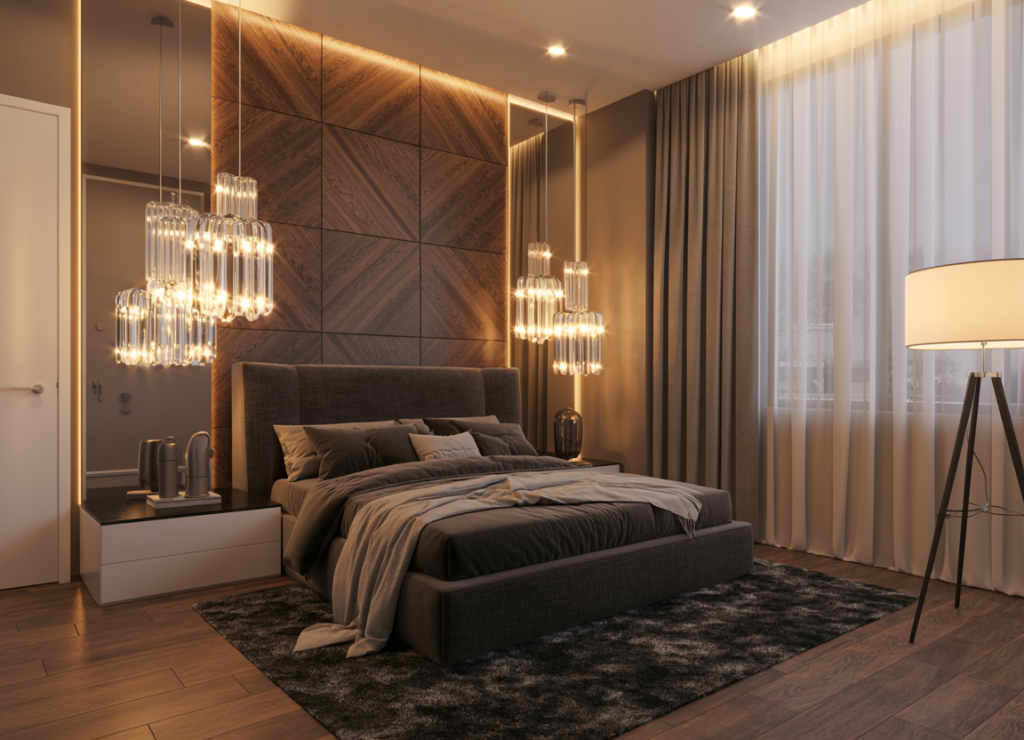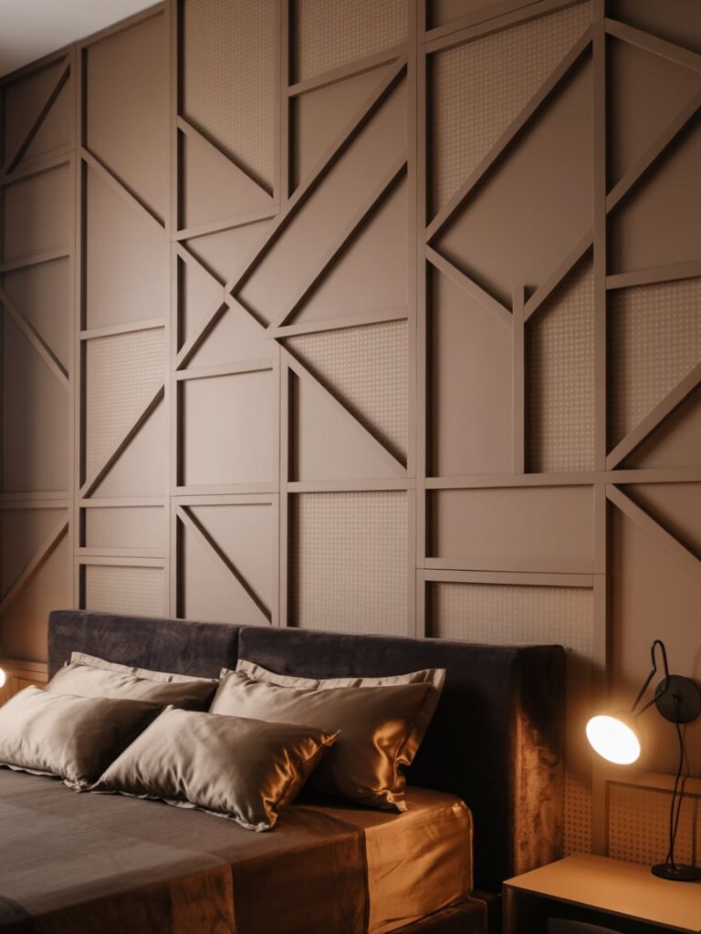 Whether you’re designing a master bedroom or a guest retreat, this dark wooden wall design brings in timeless elegance, modern style, and cozy comfort all in one.