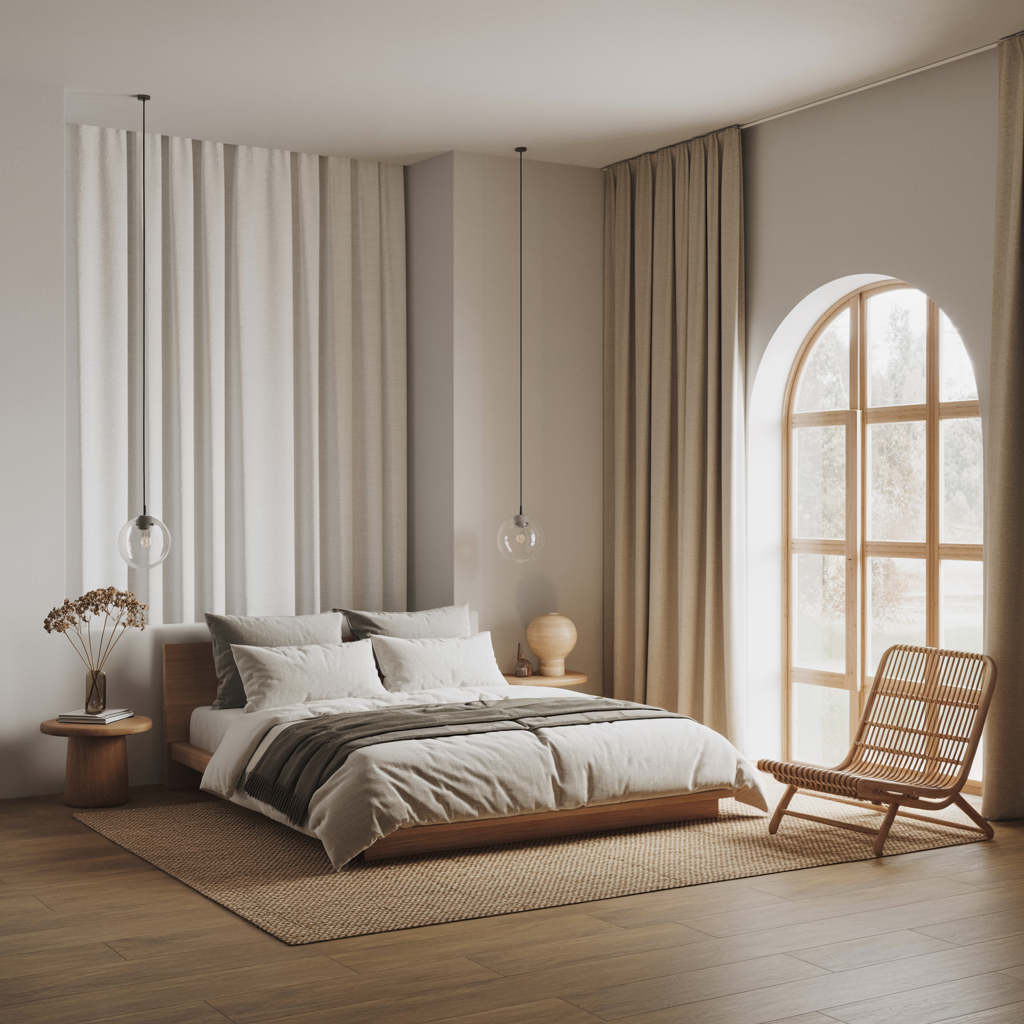 To complete the look, pair your wooden bedroom wall with a neutral color palette — think soft whites, greys, and pale earth tones. Choose furniture with clean lines and a minimalist design. Textures play a key role here: add wool throws, linen bedding, or cotton curtains for a tactile, inviting touch.