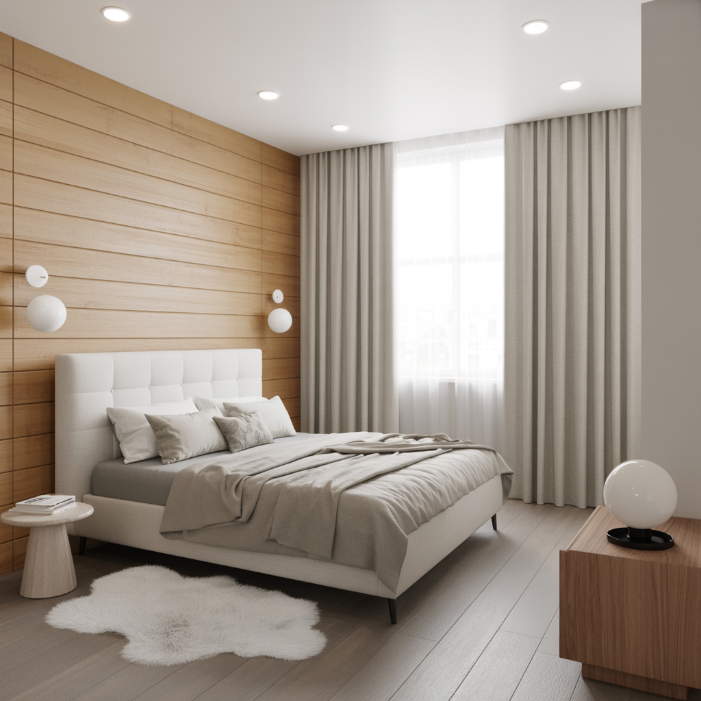 What sets this style apart is its minimalist approach — everything has a purpose, and every element adds to the sense of peace. Whether you install vertical slats or flat panels in soft-blonde wood tones, the result is always clean, modern, and elegant. This design is perfect for small bedrooms too, as it visually opens up the space and makes it feel larger.