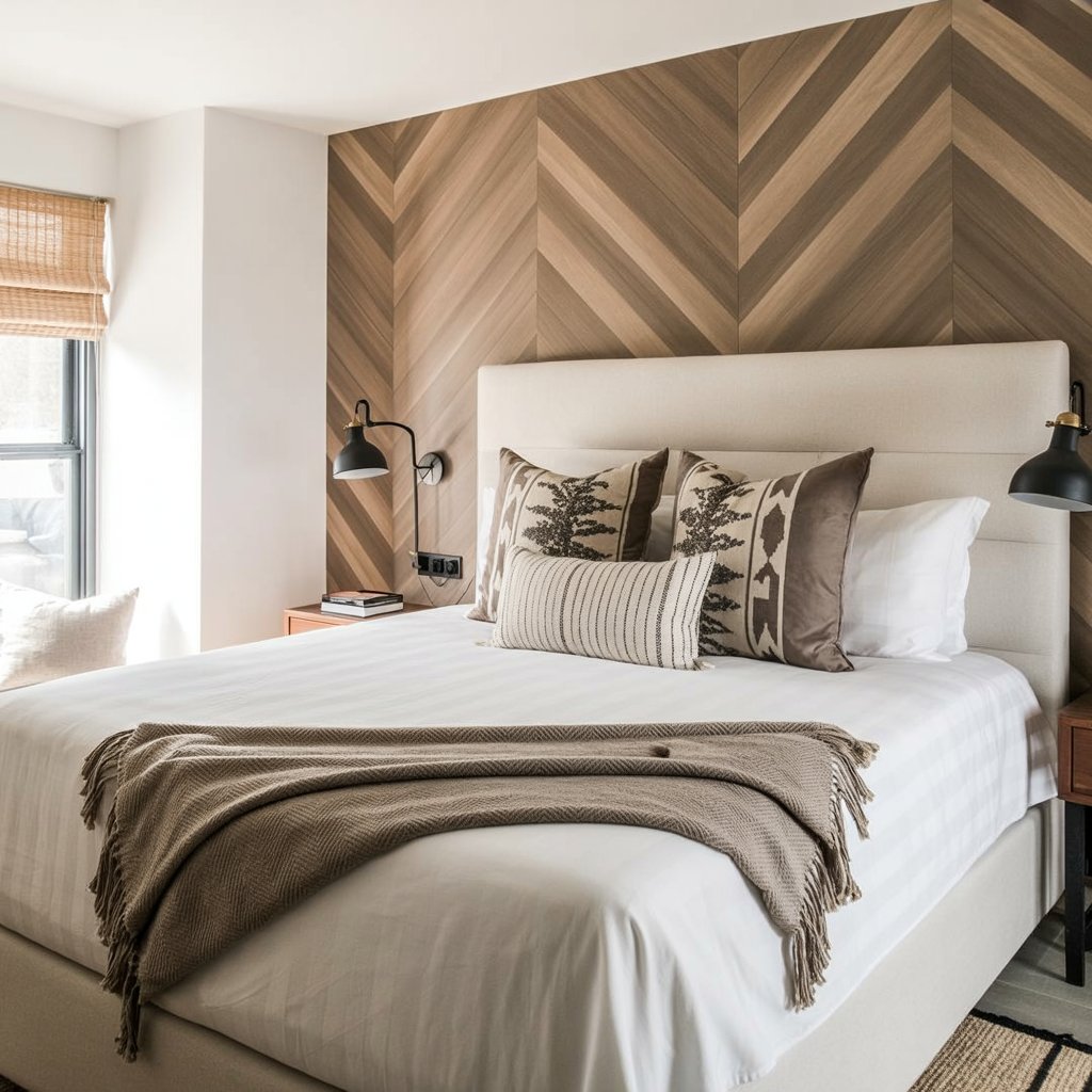 Chevron walls aren’t just about style. The repeating angles naturally guide the eye across the room, making the space feel more open, organized, and polished. Whether installed from floor to ceiling or as a half-wall accent, this pattern brings a sophisticated twist to your bedroom without overwhelming the rest of the decor.