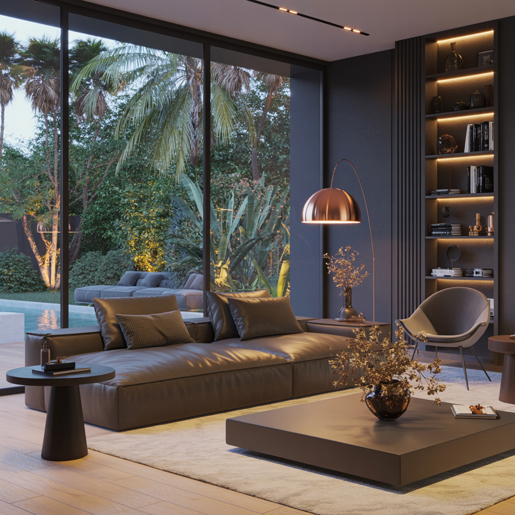 Furniture in a luxury modern setting often includes marble coffee tables, plush velvet sofas, and polished wood consoles, enhanced with warm gold or brass accents. The focus is on quality rather than quantity — selecting a few standout pieces such as a designer sectional, a sculptural armchair, or a custom coffee table to act as focal points.