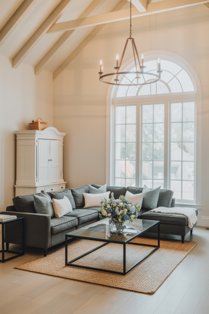 Large windows with minimal coverings allow maximum sunlight to flood the room. Soft linen sofas, light wood flooring, and sheer curtains help maintain the breezy, vacation-like vibe. The result is a space that feels like an everyday escape.