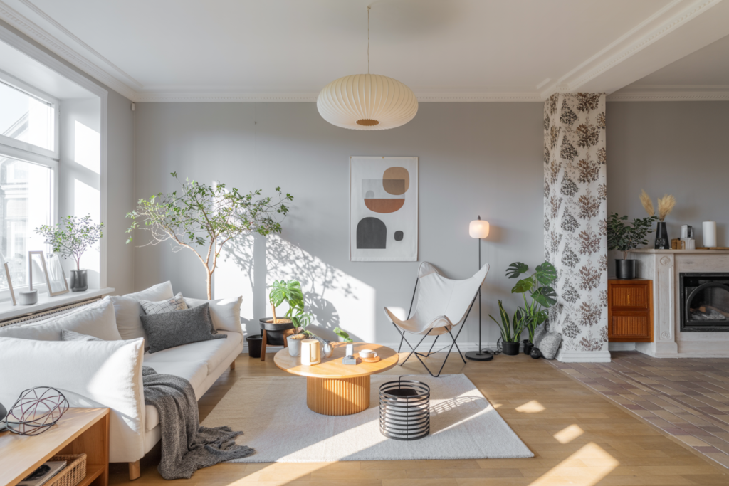 Plants are a key part of Scandinavian decor. A large potted fiddle-leaf fig, a collection of small succulents, or hanging greenery brings life and a natural pop of color to the otherwise neutral palette. This biophilic touch not only beautifies the room but also enhances well-being.