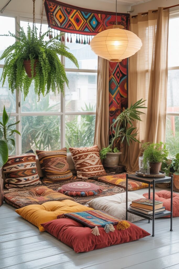 Bohemian living rooms are all about mixing patterns, textures, and colors to create a space bursting with personality. Rugs are often layered for depth, and cushions in a variety of fabrics, shapes, and prints add comfort and visual interest. The overall look is vibrant yet balanced, with no single pattern or color overpowering the room.