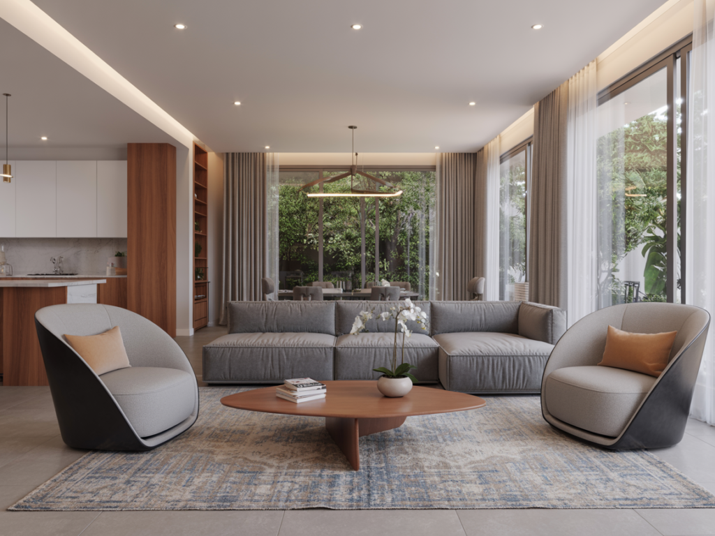 Luxury modern living rooms combine contemporary elegance with high-end finishes, creating a space that feels both stylish and indulgent. This design embraces clean lines, refined furniture, and premium materials that immediately set a sophisticated tone. Large windows or glass sliding doors are a common feature, showcasing scenic outdoor views while flooding the room with natural light and making the space feel open and inviting.