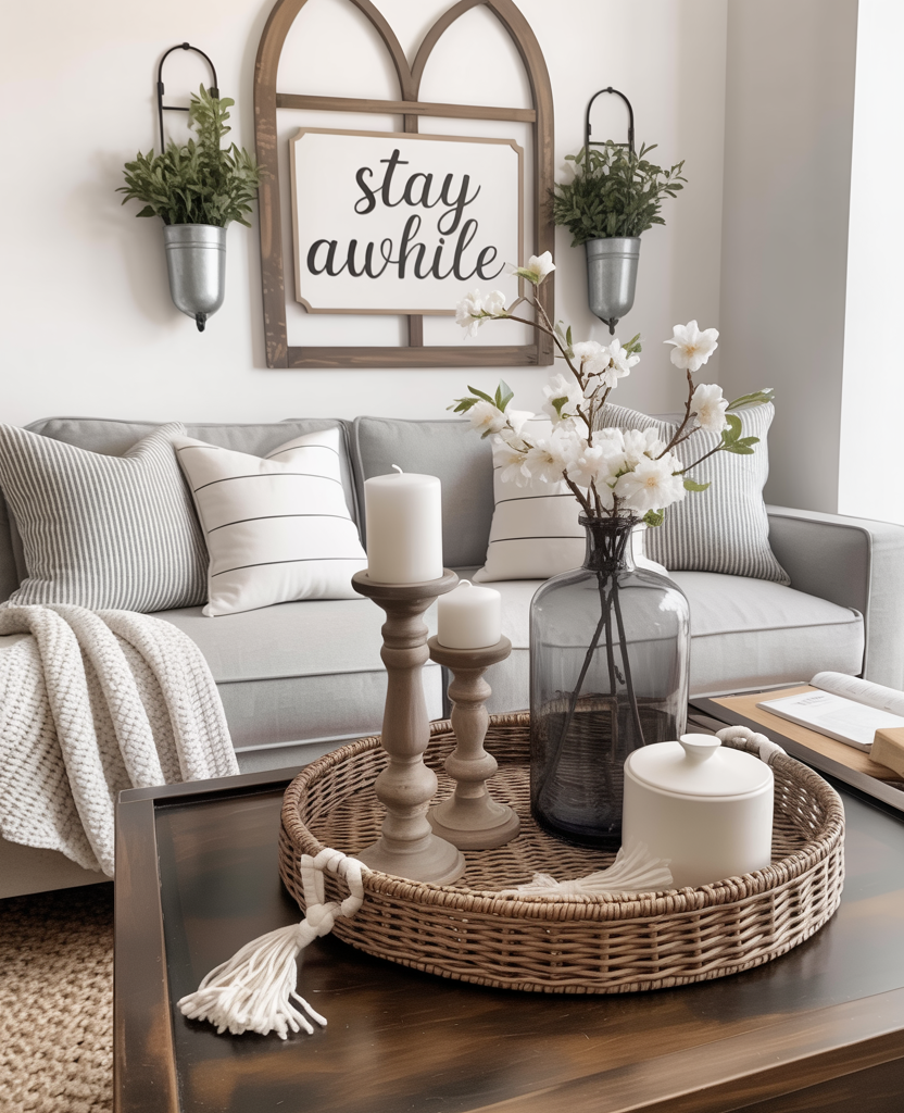 Décor in this style leans toward handcrafted and vintage-inspired pieces. Wicker baskets, handmade pottery, vintage lanterns, and old-fashioned signs contribute to the farmhouse charm. These details give the space personality while keeping it approachable.