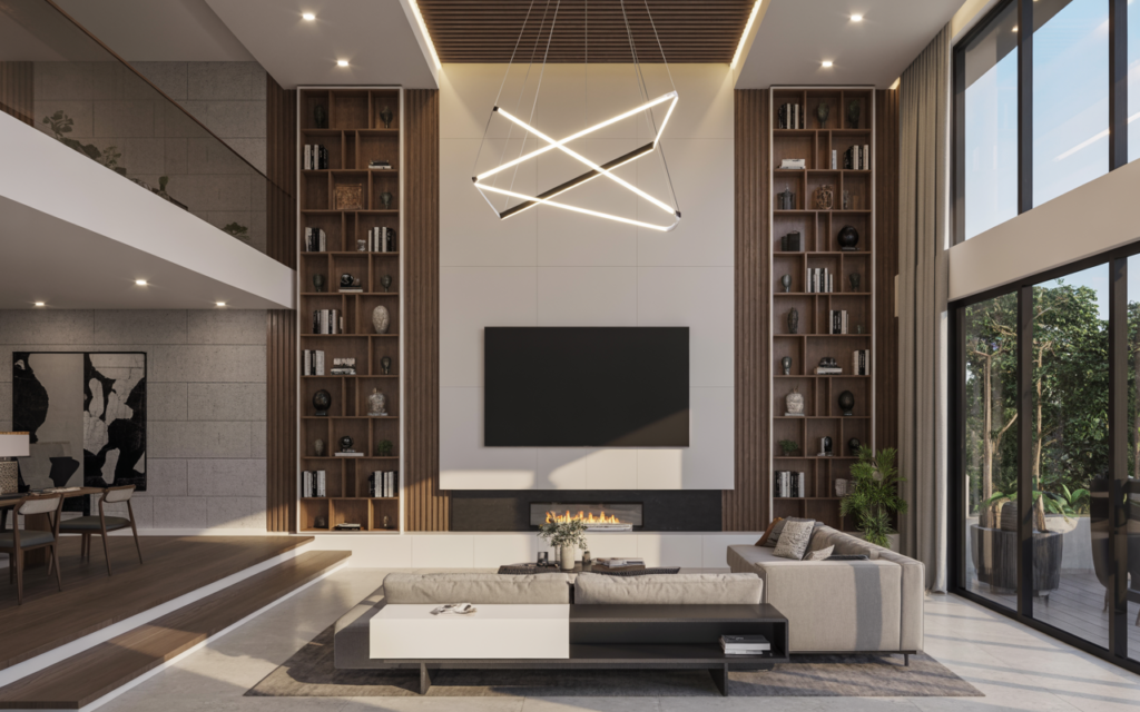 Lighting plays a vital role in defining the atmosphere. A combination of elegant chandeliers, soft wall sconces, and hidden LED strip lights provides both functional illumination and a warm, welcoming glow. For a truly striking feature, a statement fireplace clad in marble or metal can serve as the centerpiece of the room. Similarly, a custom-built media wall with integrated shelving, concealed wiring, and ambient lighting not only adds functionality but also enhances the overall grandeur of the space.