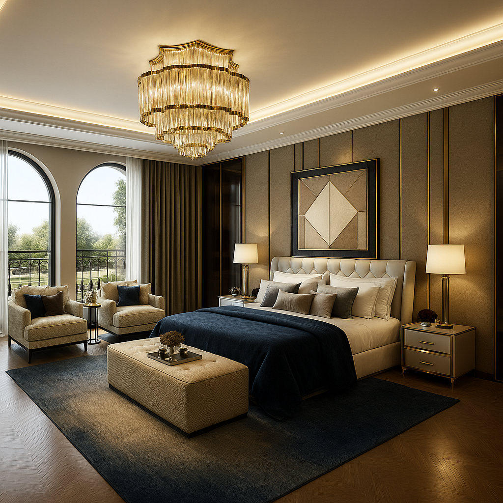 Lighting sets the tone for every room. Use layered lighting: chandeliers for elegance, recessed lights for function, and floor lamps for mood. Install dimmers to easily shift between day and evening ambiance — a small but impactful luxury in villa interiors.