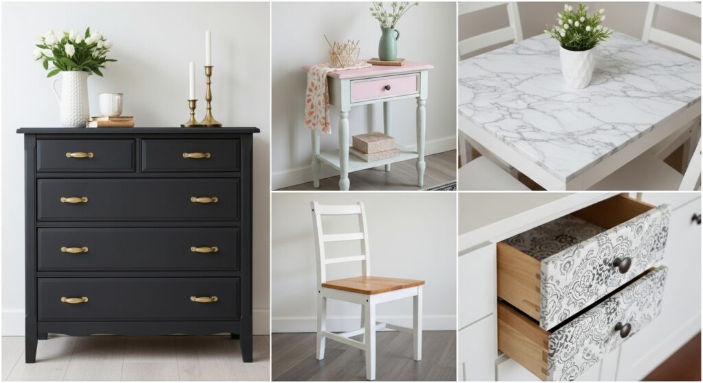 Swap out old knobs and handles with modern or vintage hardware to complete the look. Metallic finishes like brass or matte black instantly elevate even the simplest furniture pieces.