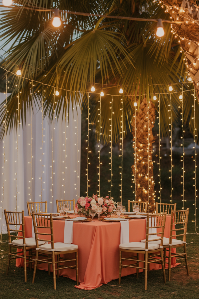 Whether you’re hosting a backyard dinner or an anniversary celebration, string lights set the tone. Use warm white bulbs for a classic, cozy look or multicolored lights for a festive feel. For a rustic touch, opt for Edison-style bulbs that give off a soft vintage glow.