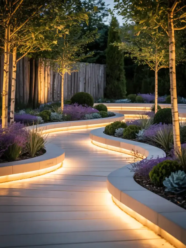 LED strip garden lighting ideas give your outdoor space a clean, high-end feel. They create a futuristic yet calm environment — perfect for minimalist gardens or luxury terraces.